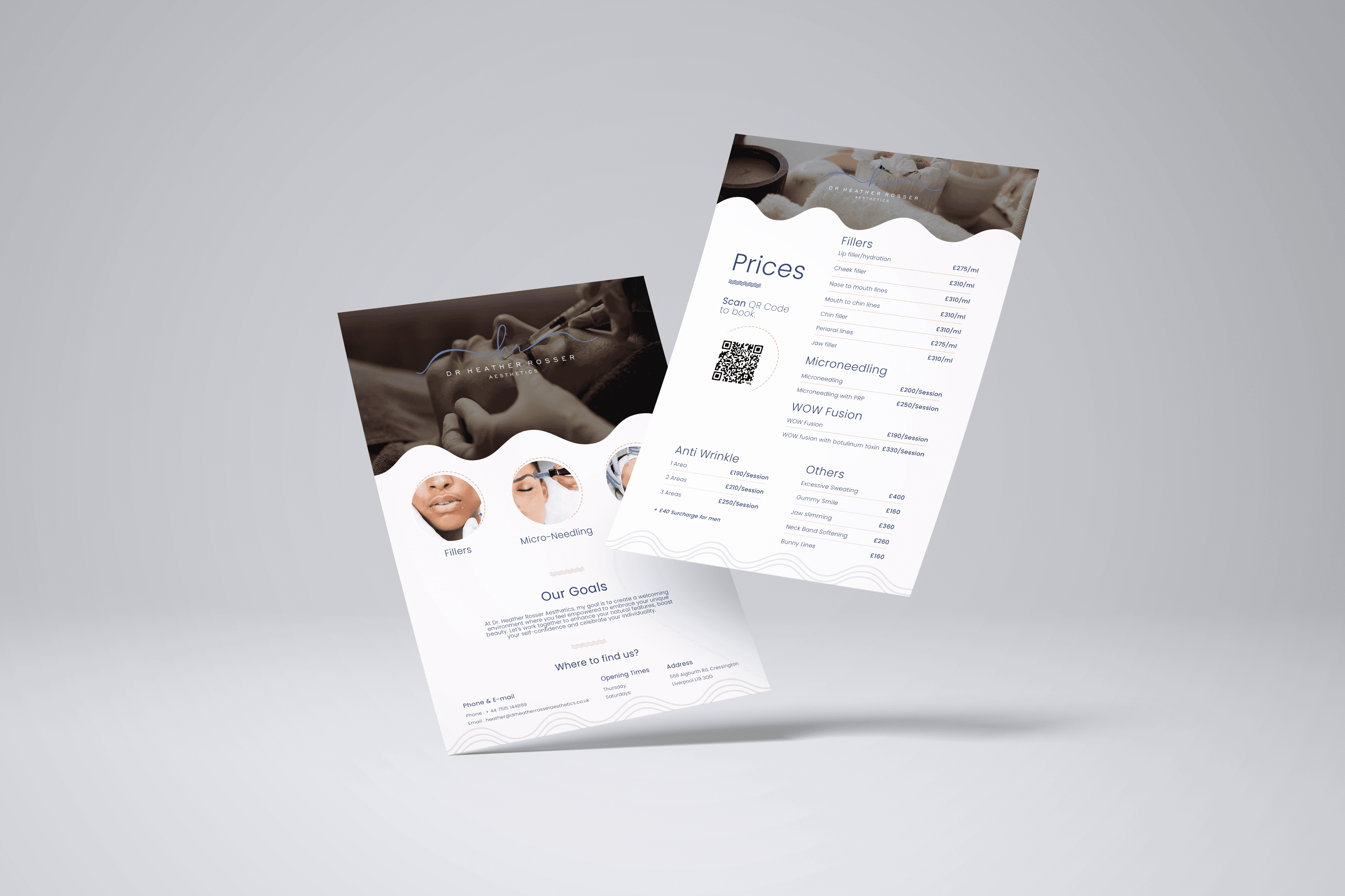 I designed a promotional flyer for Dr. Heather Rosser Aesthetics, focusing on elegance and professionalism to reflect the brand’s premium aesthetic services. The flyer features a clean layout, balanced typography, and high-quality visuals to highlight key services and special offers. The design was tailored to appeal to the target audience, ensuring it communicates trust, expertise, and luxury. This flyer effectively enhances Dr. Rosser's brand visibility while providing an engaging and informative promotional tool.